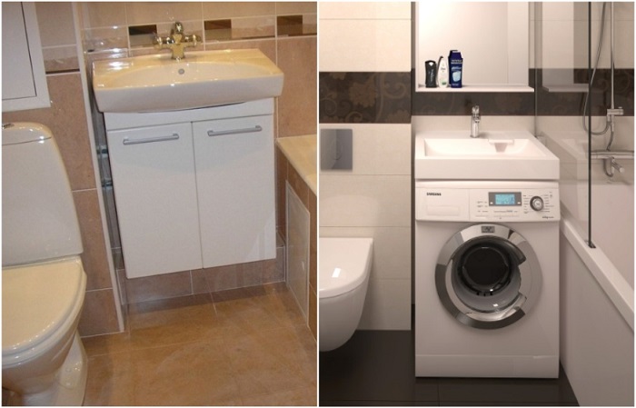 Под раковиной можно поставить тумбу или стиральную машинуИдеальным вариантом для обустройства небольшой ванной станет раковина без пьедестала, которая крепится непосредственно к стене. Она прекрасно впишется даже в крохотной пространство, а на освободившееся место можно установить тумбу для банных принадлежностей, стиральную машину, корзину для белья и пр.Чтобы мебель визуально казалась легче и не съедала и без того маленькое пространство, советуем остановить свой выбор на подвесной тумбе без ножек, открытым стеллажом или с обычными полками. Если вы арендуете квартиру и не можете заменить раковину с пьедесталом на более компактную модель, купите круглую этажерку, которая будет обрамлять ножку раковины.