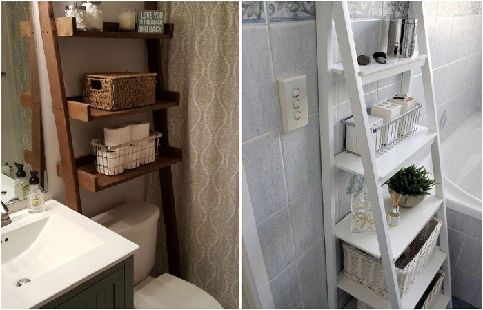Лестница станет отличным местом для храненияТак как вопросы хранения в маленькой комнате являются одними из самых насущных, нужно предусмотреть шкафчик, полки или установить лестницу-стеллаж. Этот аксессуар не займет много места, его можно расположить рядом с ванной, раковиной или прям над унитазом, предварительно сняв с лестницы несколько нижних перекладин. На таком стеллаже можно хранить полотенца, флаконы с шампунем, гелем для душа, стакан с зубными щетками и пастой, и даже комнатные растения (если вы не представляете интерьер ванной без цветов). Чтобы повысить уровень функциональности лестницы, закрепите на перекладинах крючки, навесные контейнеры.