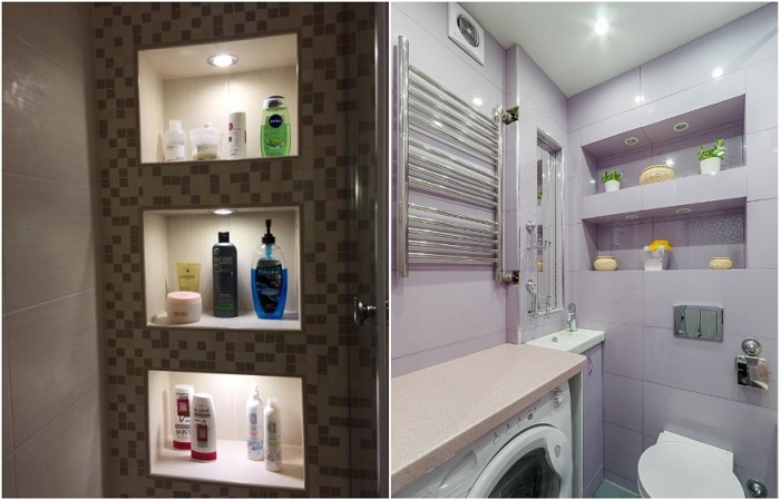 В нишах нужно предусмотреть подсветкуМы привыкли, что все вещи должны располагаться в шкафчиках за закрытыми дверцами. Однако они являются очень громоздкими и занимают много места, делая пространство загроможденным. А вот стильная ниша, расположенная рядом с ванном, над раковиной или туалетом будет смотреться гораздо более выигрышно и не менее функционально. Для крохотного санузла будет достаточно неглубокой ниши с двумя отделениями. Если в комнате узкая стена, лучше сделать горизонтальное углубление, которое сможет визуально удлинить ее. Полки могут быть выполнены из любого материала: дерева, стекла, пластика. Чтобы они смотрелись более интересно и стильно, украсьте их ракушками, привезенными с моря, или ароматическими свечами.Вам кажется, что на открытых полочках будут некрасиво смотреться средства для уборки? Тогда не зашивайте ванну плиткой, а скройте опорную конструкцию под экраном, за которым можно будет расположить и бытовую химию. Не хочется постоянно лазить под ванну в поисках нужного средства? Тогда подберите в магазине экран с открытыми полочками – красиво, удобно и функционально.