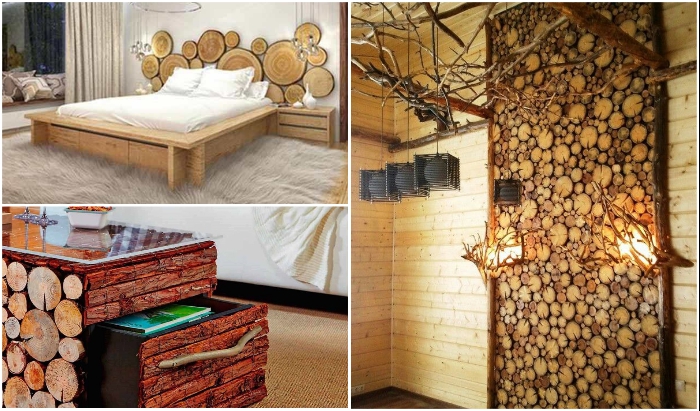 Милые безделицы из спилов древесины привнесут в спальню особую атмосферу тепла и уюта. | Фото: roomble.com.Внешний вид спилов в оформлении интерьеров или в ландшафтном дизайне имеет первостепенное значение, поэтому вопросу подбора материала следует уделить особое внимание.