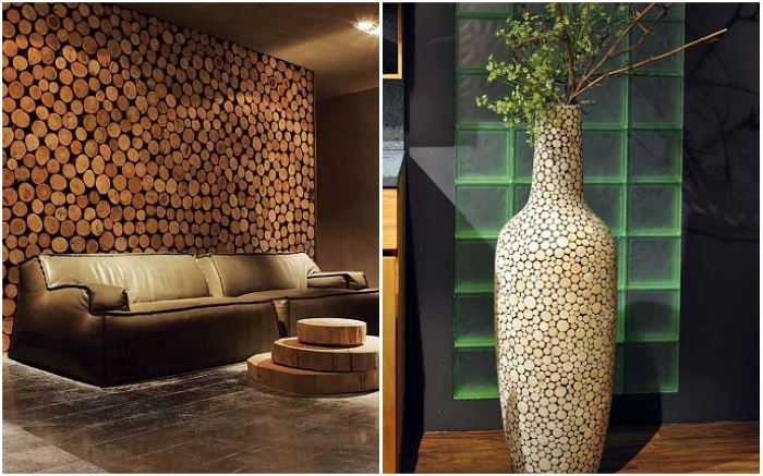 Деревянные срезы прекрасно смотрятся и на стене, и на огромной напольной вазе. | Фото: cpykami.ru/ poweredhouse.ru.Основные правила и нюансы декорирования поверхностей:- если создается панно, напольное покрытие, планируется декорирование стен, делаются перегородки и т.д., то нужно сначала подготовить поверхность (выровнять, загрунтовать, обработать антисептиком и просушить) и только потом закреплять спилы;- не стоит фиксировать материал без предварительной раскладки на поверхности. Для начала следует разложить спилы, сформировать рисунок, только после того, как увидите конечный результат, и он полностью удовлетворит, приступать к нанесению клеевого состава;- при создании пола нужно использовать только твердые сорта древесины, также во время распила внимательно следить за толщиной «кругляшей», чтобы избежать перепадов и неровностей в конечном итоге. После того, как плашки будут зафиксированы, а промежутки залиты специальным цементом, эпоксидной смолой или другим материалом, сразу после высыхания раствора следует провести контрольную проверку уровня горизонта. Если обнаружатся неровности, то процесс шлифования нужно проводить до тех пор, тока не получится идеально гладкая и ровная поверхность;- после окончания работ дерево желательно обработать специальным материалом, который предотвратит появление насекомых и плесени, при этом лучше использовать натуральные пропитки. Профессионалы могут применять специальный воск, но – это дорогостоящее удовольствие. Как правило, декоративные элементы, созданные из спилов дерева вскрывают морилкой нужного цвета, а затем лаком, если же плашки были хорошо отполированы и на боковых частях нет остатков коры – оставляют как есть. В последнем случае в доме/квартире будут долго сохраняться благоухающие запахи древесины. Хотя этот вариант категорически не подходит для дорожек, пола и тех поверхностей, которые будут подвергаться постоянному механическому воздействию человека, влаги или агрессивной среды.