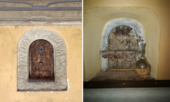 В Тоскане сохранилось около 150 средневековых люков «buchette del vino». | Фото: storienogastronomiche.it.Немного истории: Изначально «buchette del vino» появились в Тоскане и были сделаны для того, чтобы продавать остатки вина рабочим, возвращающимся со смены домой. Эти небольшие проемы в виде крошечного окна, закрывающиеся изнутри, располагались на воротах или фасаде здания, который выходил на тротуар.«Люди могли постучать в маленькие деревянные ставни и наполнить свои бутылки прямо от семей Антинори, Фрескобальди и Рикасоли, которые до сих пор производят некоторые из самых известных марок итальянских вин», – рассказывает Президент Ассоциации винных окошек Маттео Фалья. Со временем подобные окошки распространились по ближайшим регионам Италии, а во время бубонной чумы 1630 г. стали спасительной соломинкой, позволяющей сохранить свой бизнес для владельцев виноделен и не только. Учитывая расположение и габариты отверстия в стене/воротах, полностью исключался контакт с покупателем, который даже монетки при расчете не отдавал в руки, а мог положить в специальную тарелочку, наполненную уксусом.