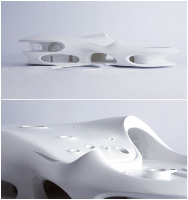 Бесшовную оболочку павильона отливают из белого бетона и с помощью ультрасовременной техники (концепт «Wormhole Library», Хайкоу). | Фото: archynaija.wordpress.com/ © MAD Architects.По сведениям редакции Novate.ru, для того чтобы отливать бетонные детали обтекаемой формы внешней бесшовной оболочки, разработчикам пришлось прибегнуть к помощи станков с ЧПУ и технологии 3D-печати. Благодаря этому получается монолитная конструкция с плавными футуристическими линиями с уже сформированными округлыми окнами разного размера и формы, дверными проемами, балконами и террасами.