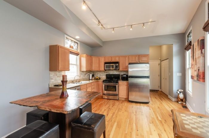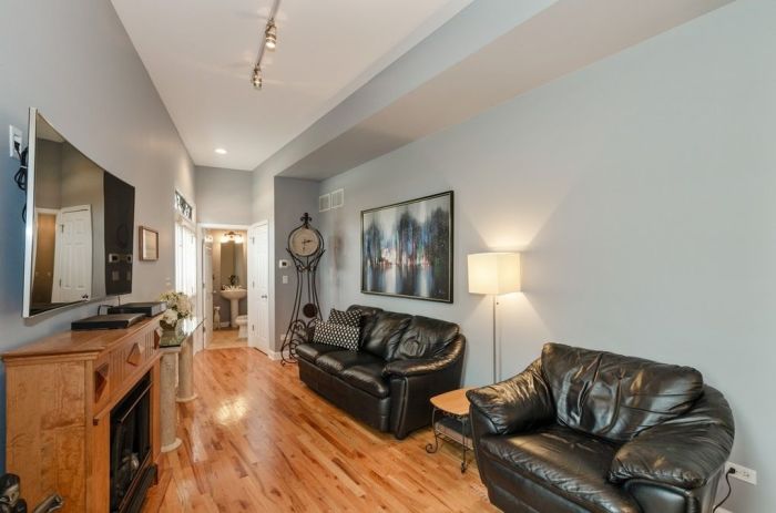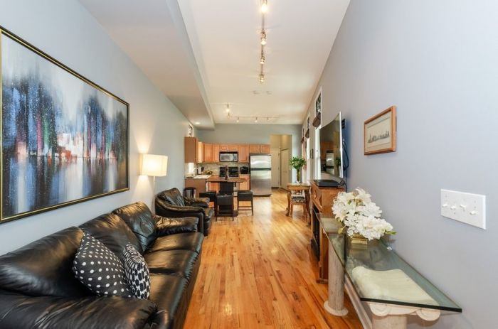 Открытая планировка первого этажа позволила организовать стильную гостиную и просторную кухню («Pie house», Дирфилд). | Фото: realtor.com/ © Alan Berlow.Несмотря на неправильность форм, площади дома может позавидовать любая среднестатистическая семья большинства стран мира. Как оказалось, только жилая площадь узкого «Дома-пирога» составляет 487 кв. м. Да и фасад выглядит довольно привлекательно и соответствует канонам классической архитектуры, так что сильно выделяться на фоне городской застройки он не будет (если не смотреть с узкой тыльной стороны сооружения).