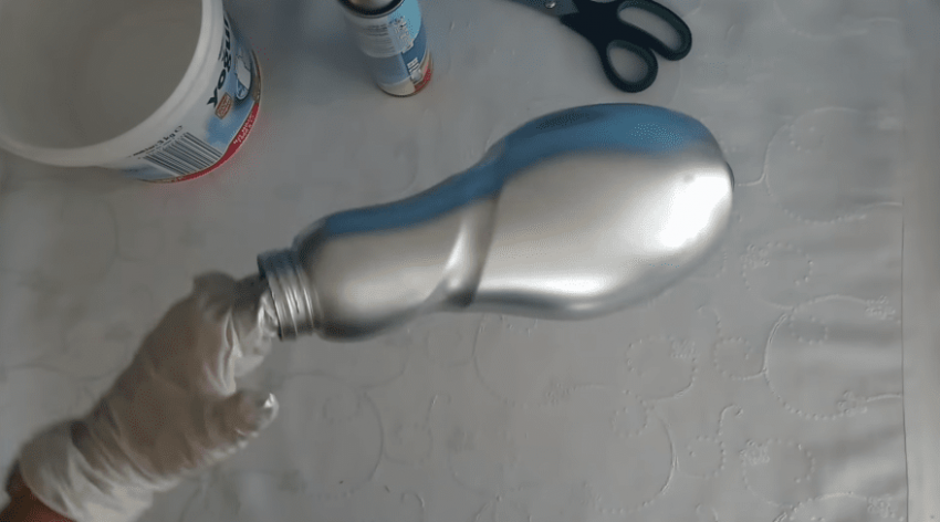 Удаляем с флакона этикетку, избавляемся от крышки, а затем окрашиваем в выбранный цвет. Идеально подойдет для основания лампы краска с эффектом металлик, способная стать дополнительным отражателем.