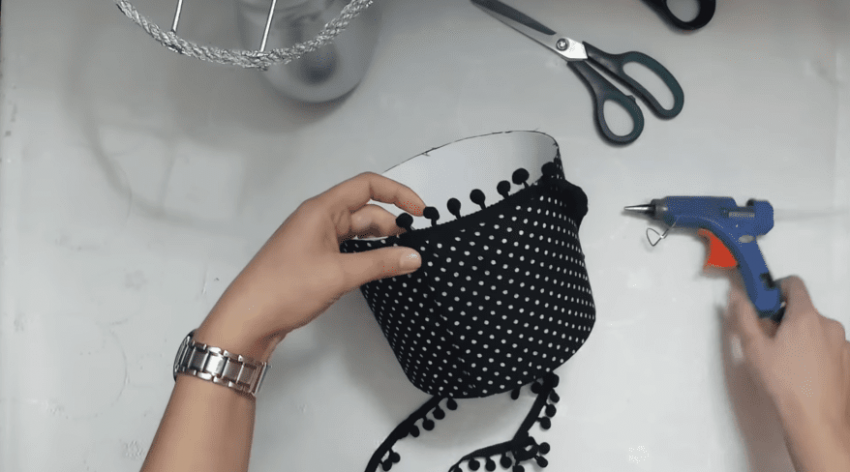 После высыхания клея окрашиваем каркас в тон основанию. Низ абажура дополнительно декорируем бахромой.