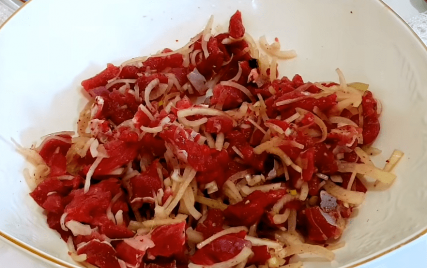 К мелко нарезанному мясу добавляем нарезанный соломкой лук и порезанный на кубики помидор. Солим, перчим, добавляем паприку. Хорошо все перемешиваем.