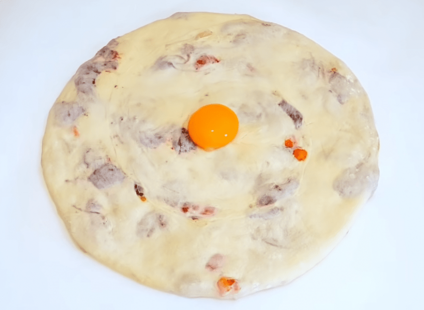 Слегка припылив заготовку мукой, раскатываем ее скалкой, чтобы получить лепешку. Поверхность обильно смазываем яичным желтком и отправляем в духовку.