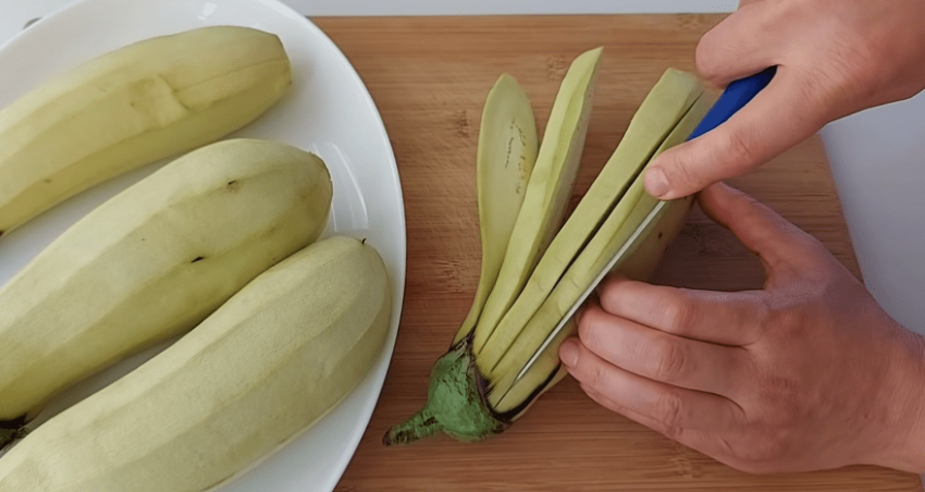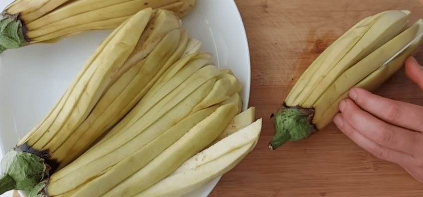 Очищаем баклажаны от кожуры, не удаляя при этом хвостики. Острым ножом нарезаем баклажаны на слайсы шириной около 1 см, не отсоединяя при этом от хвостика-основания.