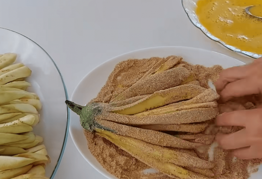 Достаем баклажаны из солевого раствора, даем стечь, а затем хорошо промакиваем бумажным полотенцем. Яйца слегка взбиваем, а затем соединяем с крахмалом и перемешиваем до получения однородной массы. Обмакиваем каждый баклажан сначала в яичной смеси, а затем в панировочных сухарях.