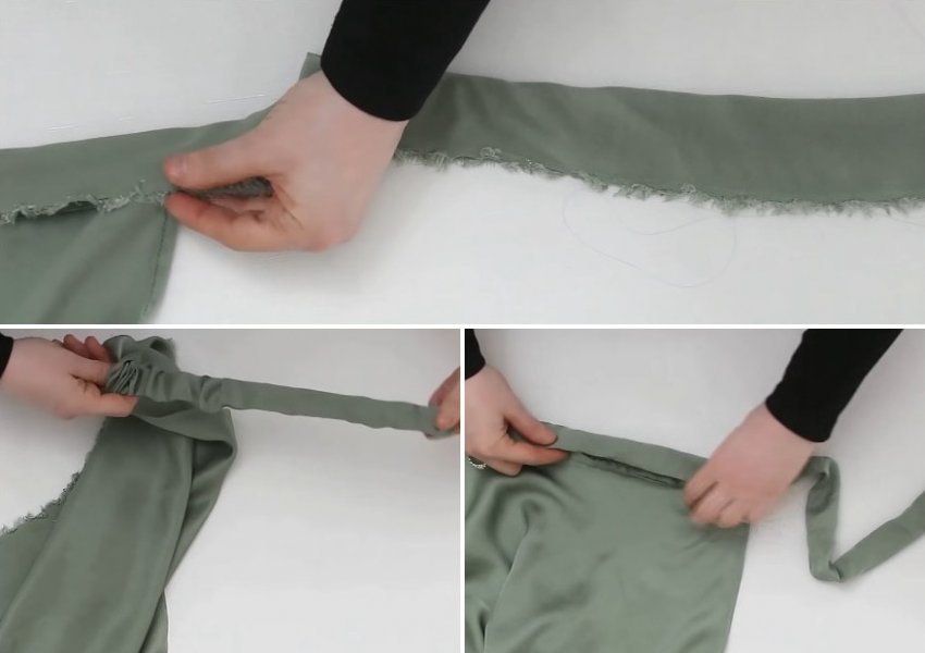 Из оставшейся после раскроя юбки ткани вырезаем ровную полосу во всю длину для формирования пояса. В нашем случае это 2.6 м на 9 см. Складываем юбку пополам по линии талии и ставим пометку. На поясе также помечаем середину. Совмещаем пометки, укладываем пояс вдоль линии талии по принципу лицом к лицу и прокладываем шов с отступом в 1 см от края в том месте, где ткань деталей совмещена.