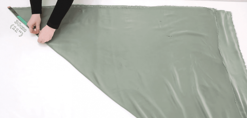 Откладываем от угла вдоль каждой из сторон вниз по 30 см, придерживая сантиметровую ленту в вершине, делаем на ткани дополнительные отметки, выдерживая то же расстояние. Затем соединяем отметки плавной линией, которая по сути является линией талии.