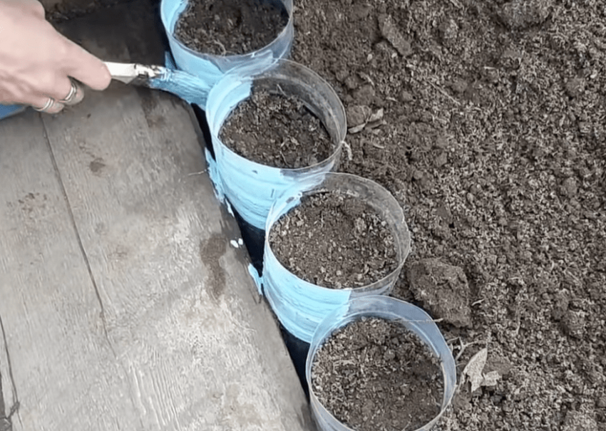 Для начала обрезаем достаточное количество бутылок одинакового диаметра по высоте. В каждой заготовке делаем по несколько боковых надрезов с небольшим отступом от дна. Это необходимо для того, чтобы излишки воды при поливе не скапливались внутри. Корням высаженных растений также будет куда прорости со временем.