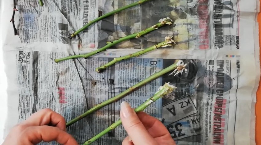 Подготовленные черенки попарно заверните в газету, обильно смоченную водой. Подготовьте таким образом все черенки.
