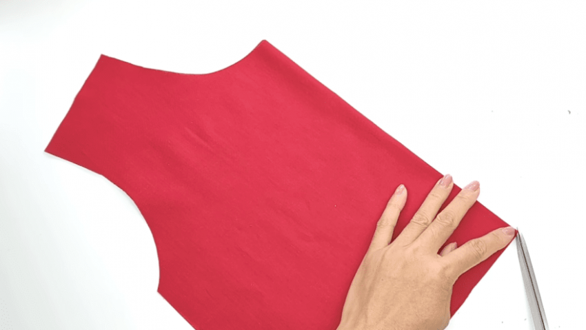 Сверху и снизу обрезаем выступающие части по контуру основной детали. Для обтачки горловины используем косую бейку шириной 3,5 см из основной ткани. Складываем ленту вдвое по всей длине и проутюживаем. Затем подгибаем края к середине, чтобы получить 4 сложения и еже раз проутюживаем.