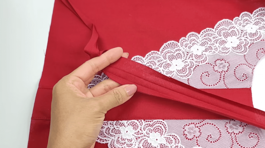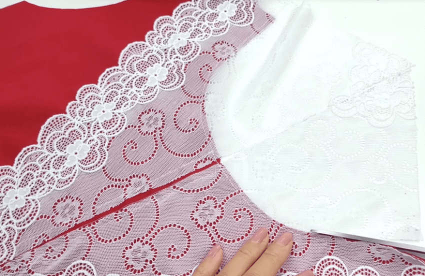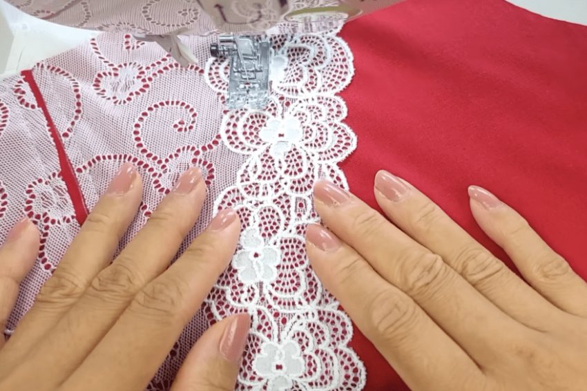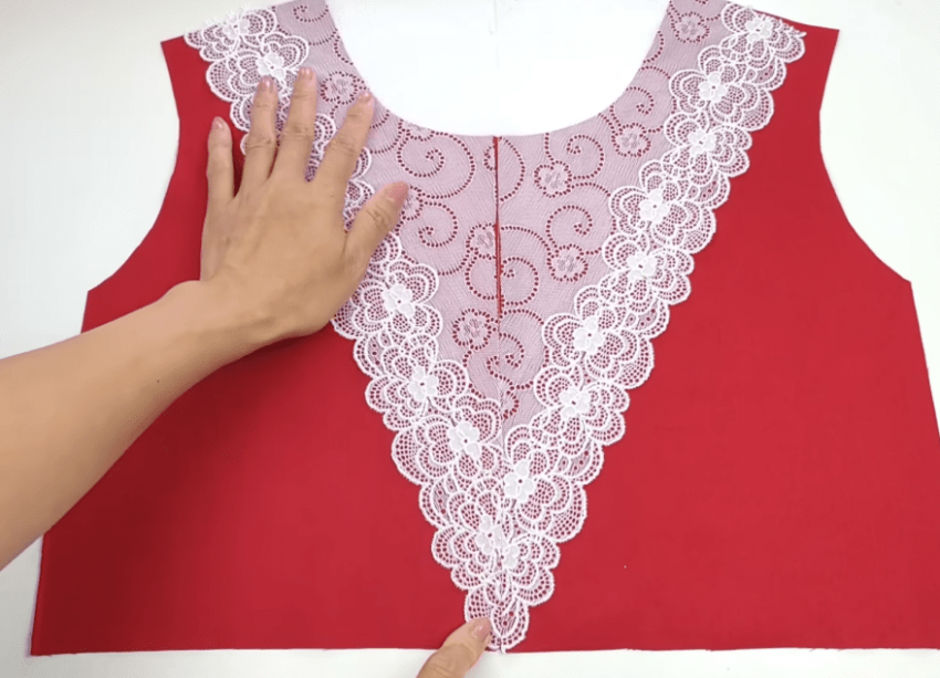 Переходим к области горловины. Дополнительно закрепляем кружево к ткани портновскими булавками, а затем прокладываем строчку с отступом от края в 0,5 см. После обрезаем излишки кружева.