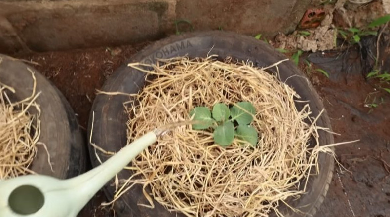 Накройте рассаду соломой и обильно полейте чистой водой.