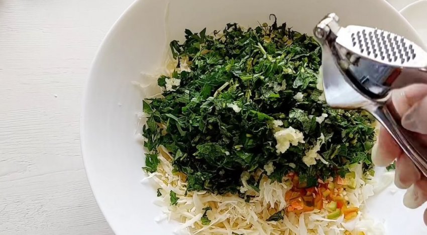 Для приготовления начинки нашинкуйте капусту, добавьте к ней мелко нарезанный острый перец, измельченную зелень и чеснок. Добавьте соль и хорошо перемешайте. Оставьте начинку на 30 минут на столе.
