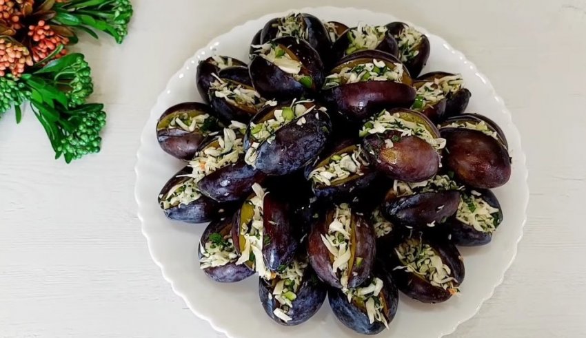 Закуски — неотъемлемая часть праздничного стола. Удивить гостей будет очень просто, если приготовить оригинальную закуску из слив. Готовится такая закуска элементарно, для нее даже не нужно стерилизовать банки и кипятить воду. Несмотря на простоту рецепта, блюдо получается очень вкусным. Будьте уверены, что гости попросят у вас рецепт. Для приготовления понадобится: черная слива — 2 кг.; лавровый лист; соль (крупная) — на каждую баночку по 1.5 ч.л; уксус (4%) — на каждую баночку по 150 мл; холодная вода; капуста — 250 гр; острый перец — 2 шт; петрушка — 1 пучок; мята — 1 пучок; чеснок — 2 головки; соль (крупная) — 1 ст.л. Для приготовления начинки нашинкуйте капусту, добавьте к ней мелко нарезанный острый перец, измельченную зелень и чеснок. Добавьте соль и хорошо перемешайте. Оставьте начинку на 30 минут на столе. Читайте также - Легкие рисунки собак смотрите красивые фото бесплатно, в виде фотогалереи и в хорошем качестве, также вы можите найти для себя то, что вам по душе . Надрежьте сливы, и извлеките из них косточки. Наполните сливы подготовленной начинкой. В банку объемом 1,5 литра положите 1 лавровый листочек. Заполните банку сливами. В каждую банку насыпьте по 1,5 ч.л соли и добавьте по 150 мл уксуса. Дополните банку холодной кипяченой водой. Закройте заготовки крышкой и хорошо потрясите, чтобы уксус смешался с водой. Оставьте сливы мариноваться минимум на неделю. Заготовку можно хранить год в прохладном месте.