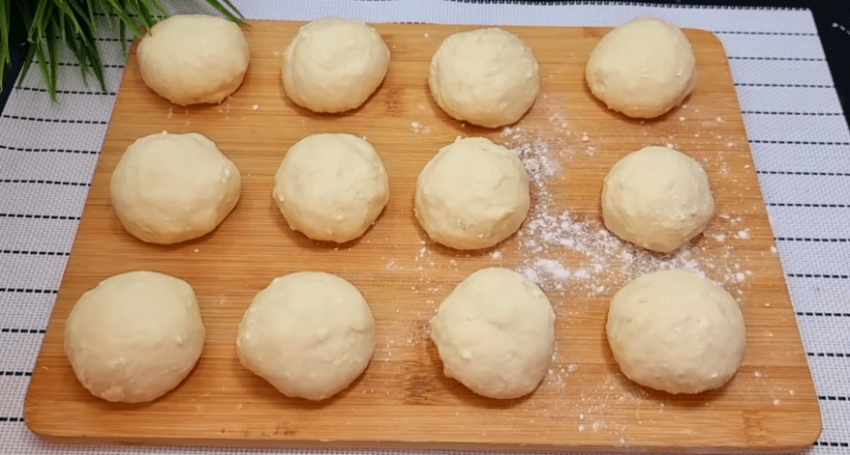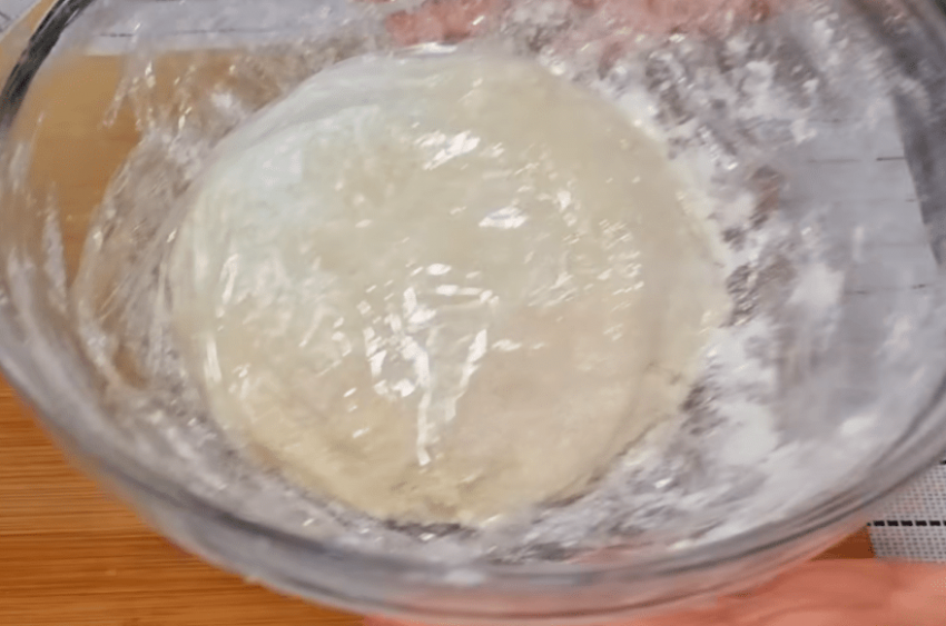 Постепенно водим в смесь муку. Замешиваем тесто. Оно получается мягким и податливым. Готовое тесто накрываем пленкой и даем постоять буквально 10 минут.