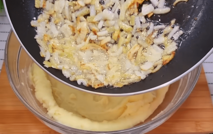 Отвариваем картофель до готовности и делаем пюре. Нарезаем лук мелким кубиком, обжариваем до золотистого цвета, отправляем к картофельному пюре и хорошо перемешиваем. При необходимости досаливаем и перчим по вкусу.