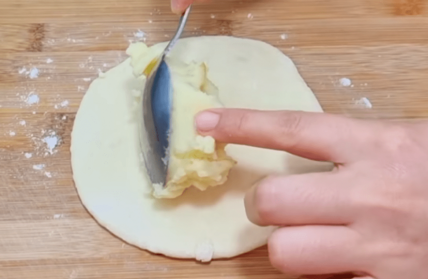 Раскатываем колобок, наполняем начинкой, а затем запечатываем в пирожок.