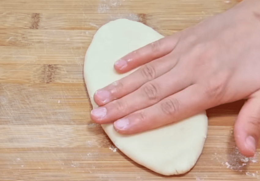 Аккуратно превращаем пирожок из обычного в плоский и тонкий. Тесто настолько мягкое и податливое, что сделать это можно просто руками, не используя скалку.