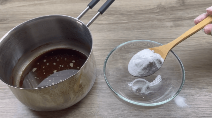 Для начала заливаем 1 столовую ложку натурального молотого кофе 100 мл воды и доводим до кипения. Даем кофе полностью остыть. В подходящую емкость кладем 3 столовых ложки соды.