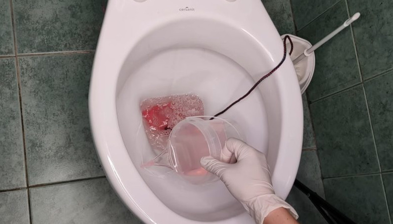 Поместите воздушный шарик в унитаз так, чтобы полностью перекрыть слив. Вылейте в унитаз подготовленный чистящий раствор.