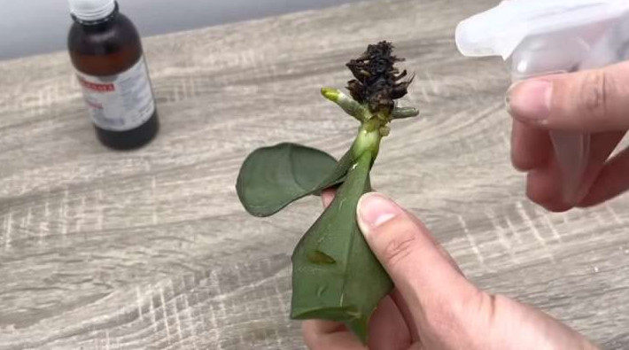 Разведите 5 мл аптечной перекиси водорода в 100 мл чистой воды комнатной температуры. Опрыскайте обеззараживающим раствором листья и «пенёк», оставшийся от корней. Оставьте на салфетке на ночь (6-8 часов).