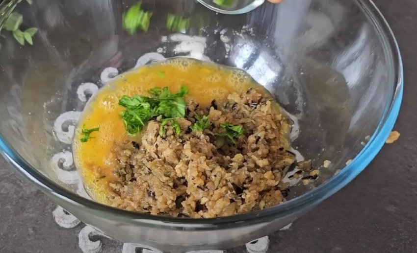 Хорошо отожмите натертый баклажан и соедините его с яйцами, взбитыми с солью и перцем. Добавьте зелень по вкусу и хорошо перемешайте.