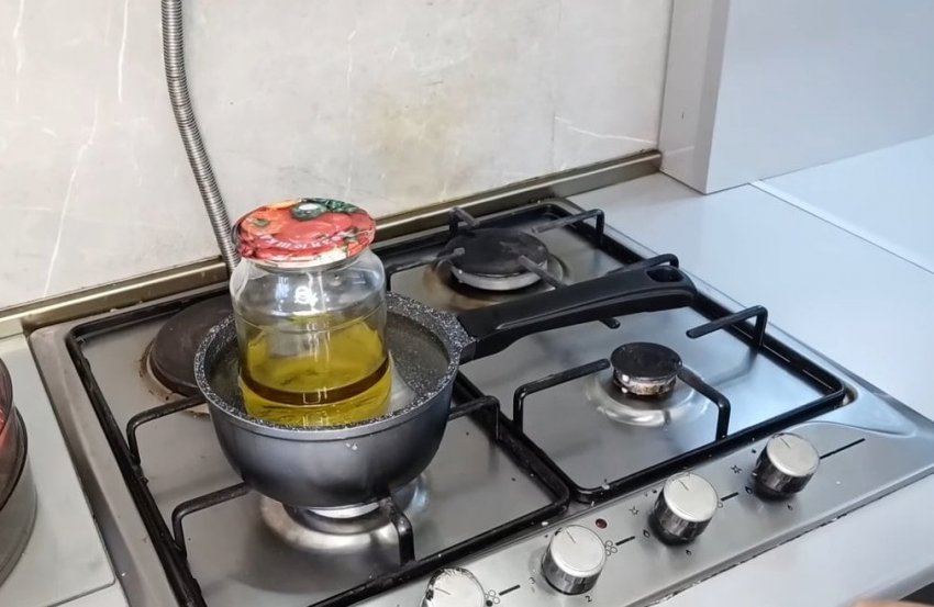 Для заливки томатов смешайте 4 части растительного масла и 1 часть оливкового масла. Нагрейте масло на водяной бане до температуры 100 градусов, важно не перегреть масло.