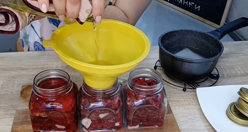 Для хранения рекомендуется использовать небольшие банки объемом 0,5 л — 0, 7 л. Выложите вяленые томаты в банки, добавляя пластины чеснока между слоями. Это сделает вкус закуски еще более выразительным.