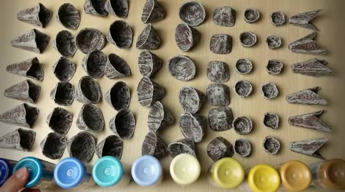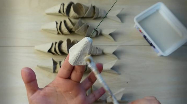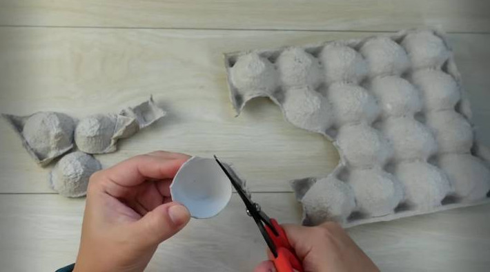 Для работы понадобятся яичные лотки самого разного размера, чтобы рыбки получились интереснее. Пригодятся даже лотки для перепелиных яиц. Разрежьте все лотки на конусы.