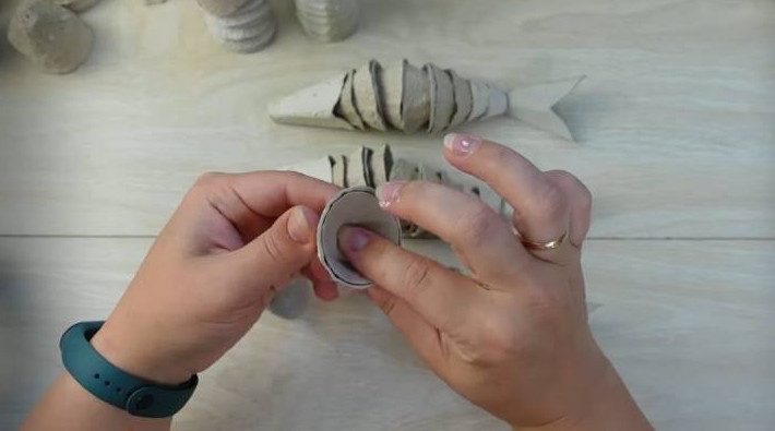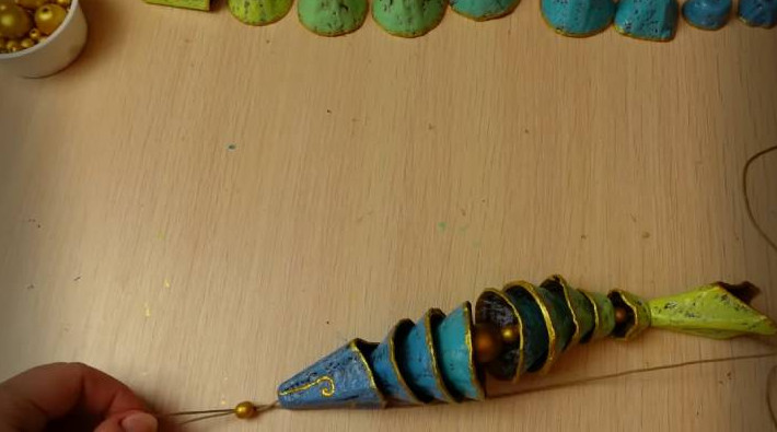 Соберите рыбку из конусов разного размера, причём глубокие конусы склейте с конусами от перепелиных яиц, чтобы они не были такими глубокими.