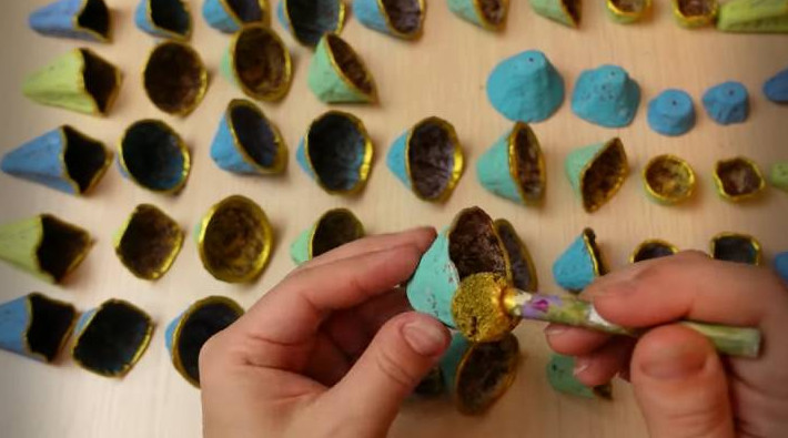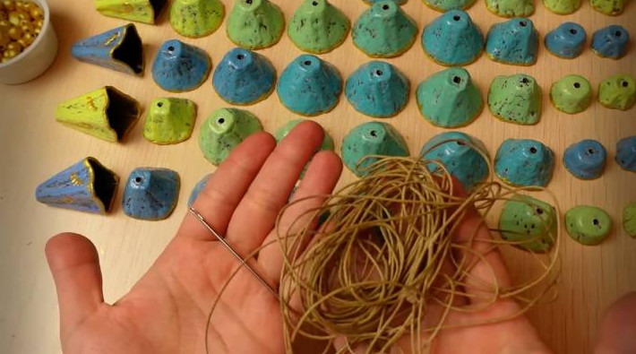 Только посмотрите, каких чудесных рыбок можно сделать для декора из обыкновенных яичных лотков! Они получаются как будто керамические: плотные и звенящие. Семейный handmade/youtube Для работы понадобятся яичные лотки самого разного размера, чтобы рыбки получились интереснее. Пригодятся даже лотки для перепелиных яиц. Разрежьте все лотки на конусы. Семейный handmade/youtube Соберите рыбку из конусов разного размера, причём глубокие конусы склейте с конусами от перепелиных яиц, чтобы они не были такими глубокими. Семейный handmade/youtube Теперь рыбок нужно покрыть чем-то, чтобы получилась «керамика». Варианта два: это либо любая самоотвердевающая на воздухе масса (размоченная в воде на сутки до состояния густой сметаны), либо шпатлёвка. Наносить следует 2-3 слоя, давая каждому просохнуть. Семейный handmade/youtube В каждой детали тонким сверлом просверлить отверстие. Затем покрыть все поделки грунтом. Семейный handmade/youtube Покрасить под керамику: сначала коричневой краской, затем сухой кистью пройтись белым цветом. Наконец, настала пора красить чешуйки рыбы в разные цвета! Здесь можно дать волю фантазии. Семейный handmade/youtube Кстати, ещё понадобятся деревянные бусины разного размера, чтобы собрать рыбку. Край конусов украсьте золотой краской. Семейный handmade/youtube На шнур с иглой соберите поочерёдно рыбку, попеременно продевая бусины и конусы. Семейный handmade/youtube В серединке конусы будут смотреть в противоположные стороны. Завяжите края шнура. Семейный handmade/youtube Рыбки очень мило смотрятся, чудесно звенят — ну, совсем как керамические! Семейный handmade/youtube