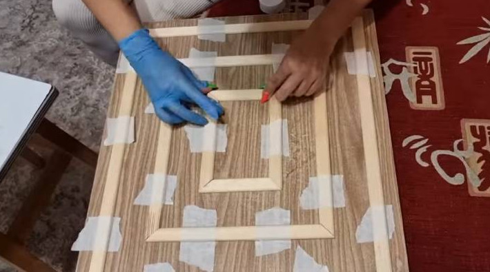Всю поверхность зашлифовали наждачкой, дверцы сняли. На них на жидкие гвозди прикрепили рейки 2 см толщиной, как показано на фото ниже, в виде трёх рам.