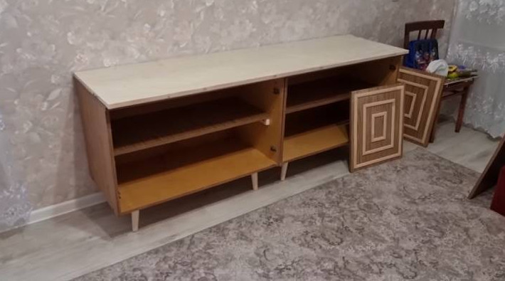 Старую советскую стенку, которая слишком массивная и совершенно не вписывается в современный интерьер, было решено переделать под стильную, современную тумбу под ТВ. Получилось прилично сэкономить на покупке новой мебель, и результат превзошёл все ожидания!