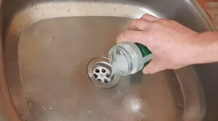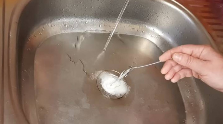 Второй способ — это засыпать в слив по паре столовых ложек соды и соли. Немного пролить водой, чтобы они попали в канализацию.