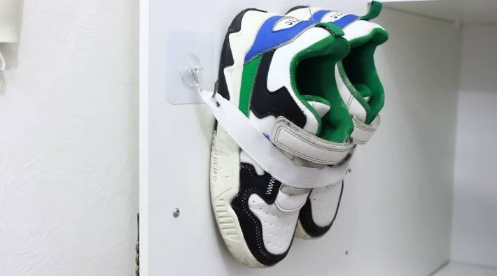 Чтобы по-максимуму использовать всё имеющееся пространство в доме, храните чистую обувь таким образом. На дверце шкафа закрепите крючки на липучках. Отрежьте кусок резинки, проделайте в них отверстия, зацепите на крючки. Теперь можно удобно подвесить обувь!
