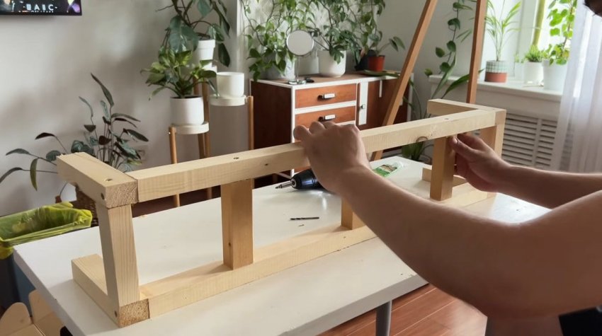 Соберите каркас короба из толстых деревянных брусков, ориентируясь на подготовленный ранее эскиз.