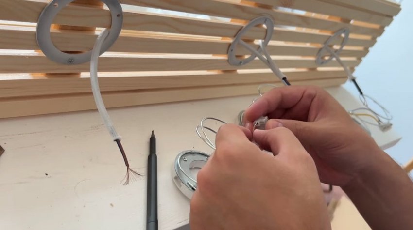 Прикрутите светильники к поперечным рейкам каркаса ящика.