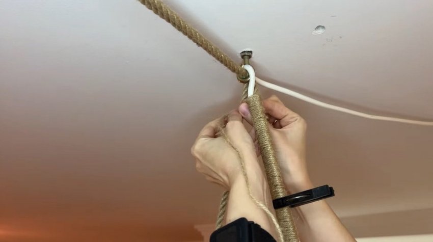Белый электрический провод задекорируйте джутовым шпагатом.