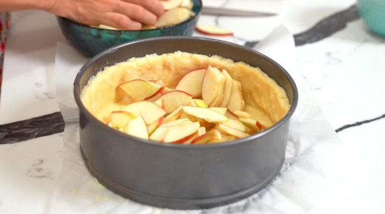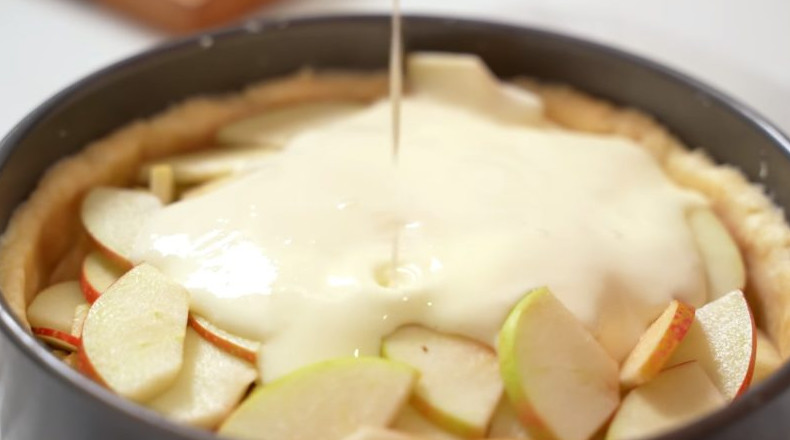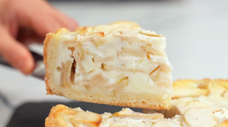 От свежей домашней выпечки с яблоками не откажутся ни взрослые ни дети. Но не спешите в очередной раз готовить всем надоевшую шарлотку, ведь используя самые простые ингредиенты, можно приготовить гораздо более интересное лакомство, которое по достоинству оценит вся семья Alina FooDee/youtube Для приготовления понадобится: мука — 200 г; сливочное масло — 100 г; сметана — 80 г; разрыхлитель — 1 ч.л; соль — щепотка; сахар — 1-2 ст.л; яблоки — 3-4 шт; сметана — 250 г; кукурузный крахмал — 40 г; сахар — 60 г; ванильный сахар — 10 г; яйцо — 1 шт. Соедините муку, разрыхлитель, соль и сахар. На крупной терке натрите замороженное сливочное масло. Перетрите ингредиенты руками, чтобы получить рассыпчатую крошку. К крошке добавьте 80 гр сметаны и замесите мягкое тесто, которое должно иметь неоднородную структуру. Alina FooDee/youtube Заверните тесто в пищевую пленку и поместите в морозильную камеру на 30 минут. Alina FooDee/youtube Для приготовления сметанной заливки соедините кукурузный крахмал с яйцом, сахаром, ванильным сахаром и оставшейся сметаной. Alina FooDee/youtube Достаньте тесто из морозильной камеры, посыпьте мукой и раскатайте в тонкий пласт. Поместите тесто в форму, сформуйте бортики и подравняйте края. Выложите нарезанные на дольки яблоки на тесто. Alina FooDee/youtube Залейте пирог сметанной заливкой и выпекайте его в предварительно разогретом до 180 градусов духовом шкафу около 50 минут. Alina FooDee/youtube После того как пирог полностью остынет, извлеките его из формы и подавайте к столу. Alina FooDee/youtube
