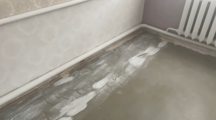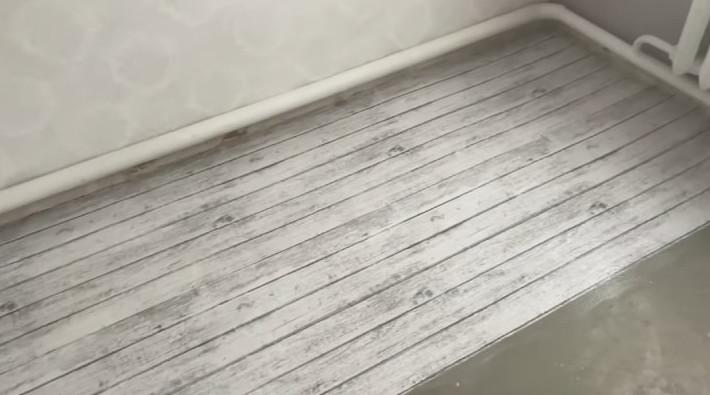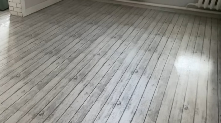 Пол не нужно специально подготавливать к работе — достаточно просто помыть. Это бюджетный, временный вариант перед капитальным ремонтом. Промажьте пол универсальным клеем ПВА.