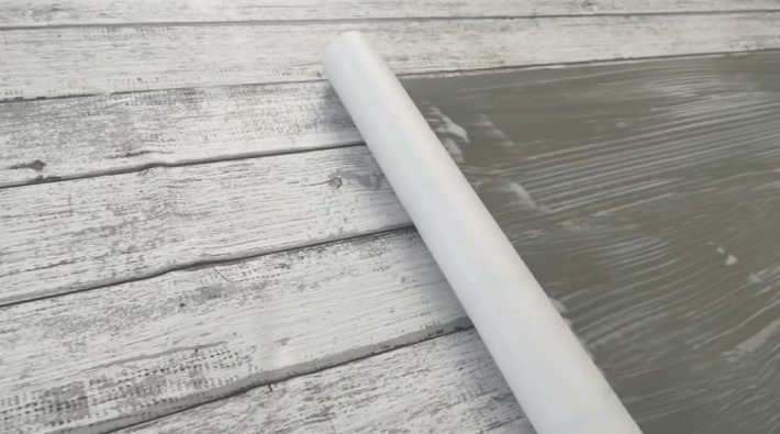 Поверх приклейте обои. Выбирайте обои с таким рисунком, который лучше всего подойдёт для пола. Например, в данном МК мастерица выбрала обои с имитацией деревянных досок.