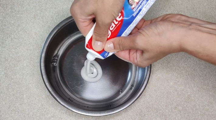 Отмерьте 150 мл столового уксуса. Сюда же отправьте совсем немного самой дешёвой зубной пасты (или то, что осталось на дне тюбика) — 0,5 ст. л.