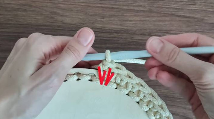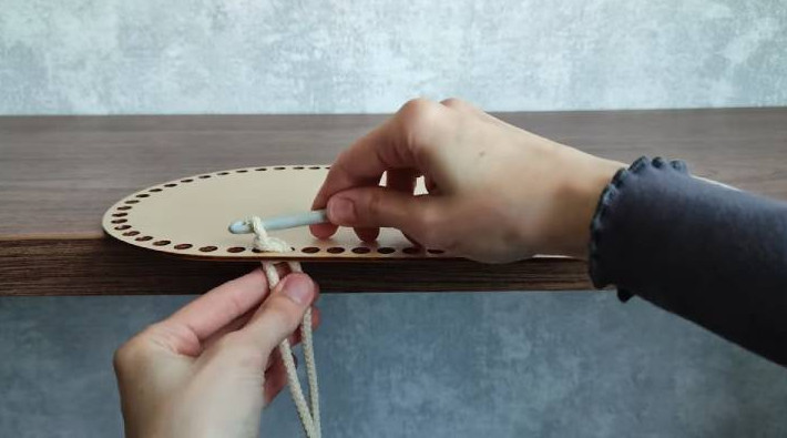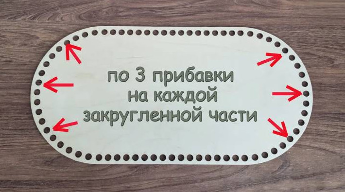 Подготовьте деревянное дно для корзины. Его можно найти в магазине для рукоделия и на маркетплейсах. На каждой закруглённой части дна в первом ряду будем делать прибавки — по 3 шт. с каждой стороны, на равном расстоянии друг от друга. Для удобства перед вязанием нарисуйте стрелки карандашом на дне, чтобы не запутаться.