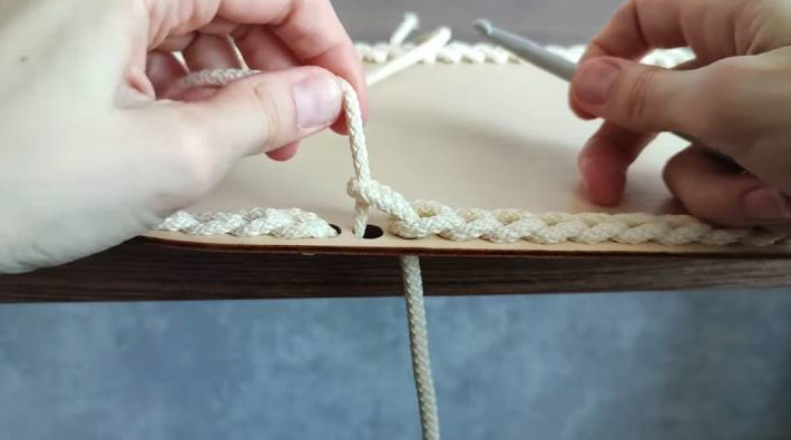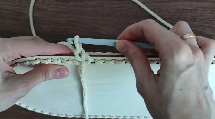 Сначала вяжется база, потом — первый ряд. Отмерьте примерно 50 см шнура — это хвостик. Он понадобится для того, чтобы с его помощью закрывать ряды. Вытяните рабочую нить снизу вверх крючком и сделайте петлю.