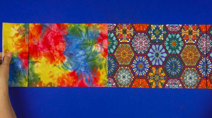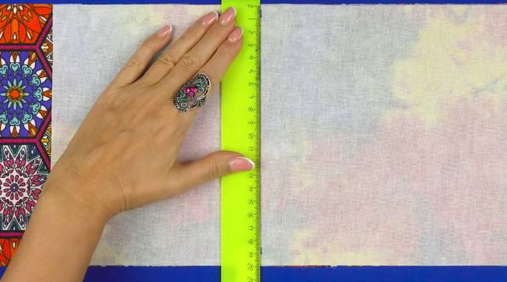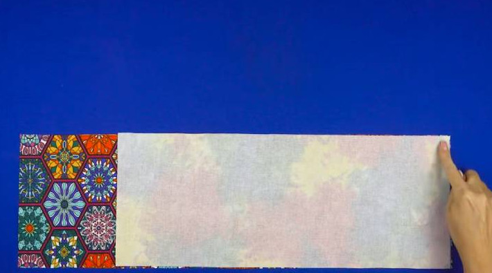 Возьмите два отрезка ткани: 50*20 см и 65*20 см. Сложите один на другой, как показано на фото ниже, и прошейте сбоку.